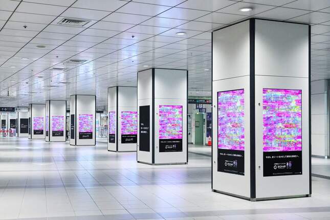 ツイートに添えられた動画には、デジタルサイネージが並ぶ駅構内の様子が映されている。その全ての液晶画面でブロックノイズがちらついており、まるで駅中の広告が壊れてしまったような雰囲気を放つ。そのうちの1つに半透明の赤シートをかざすと、「これを見ている君に幸あれ」などの応援メッセージがくっきりと浮かび上がる。