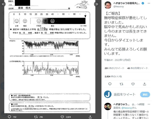 へずまさんはツイッターで、睡眠時無呼吸症候群について検査した結果とみられる書類を公開。そこには、「消灯中1時間あたり平均約119回呼吸が停止(または低下)していました」などと書かれていた。