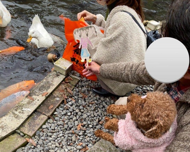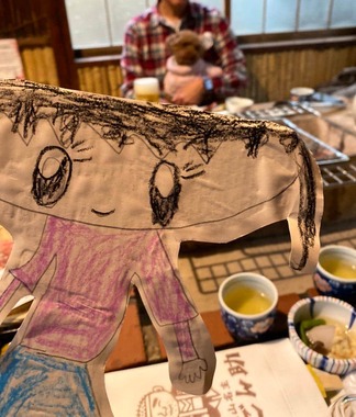 投稿には、家族で飲食店や池を観光した際の写真が4枚添付されている。いずれも、まるで同行者の1人であるかのように、子供らしいタッチで描かれた笑顔の女の子の絵が写り込んでいる。絵は人型に切り抜いて割り箸に貼り付けた状態だ。
