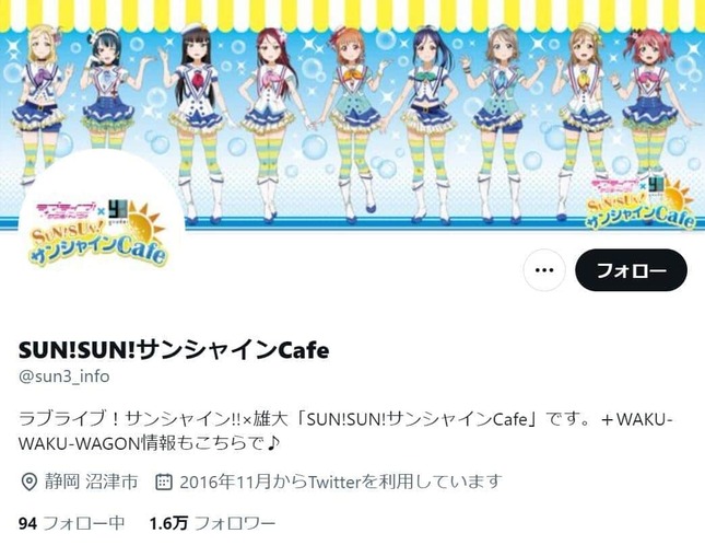 注意喚起したのは、沼津市にあるカフェ「雄大フェスタ SUN!SUN!サンシャインCafe」の公式アカウントだ。「ラブライブ!」シリーズの第2作にあたる「ラブライブ!サンシャイン!!」の公式コラボカフェとして営業している。