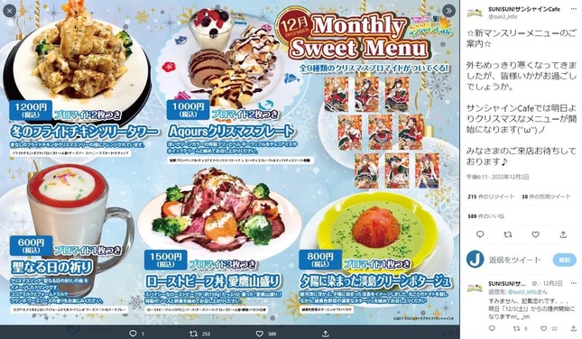 ツイッターで「こんにちはサンシャインカフェです お店からのお知らせです」として、利用客のマナー違反に苦言を呈した。12月3日にクリスマスメニューが始まった中、「お料理を過剰に注文し料理を残して帰られる方、一切手を付けずに帰られる方がいらっしゃいました」という。