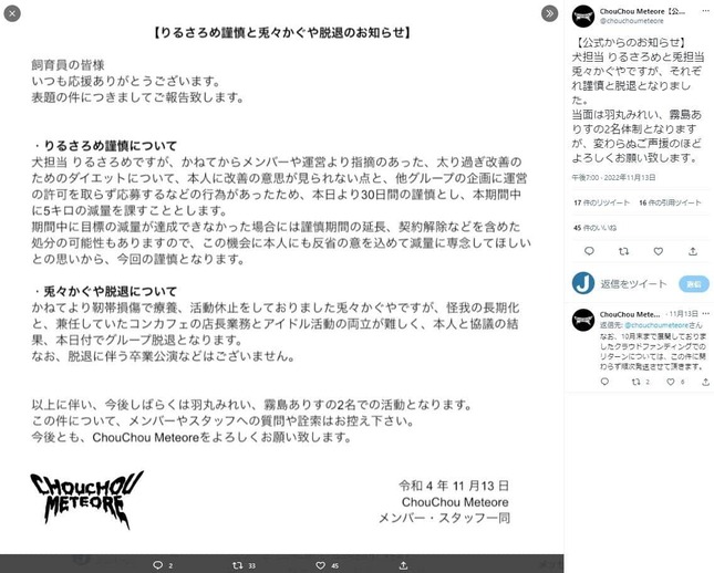地下アイドルグループ「ChouChou Meteore」が2022年12月12日、謹慎処分を言い渡していたメンバー「りるさろめ」さんの脱退をツイッターで発表した。