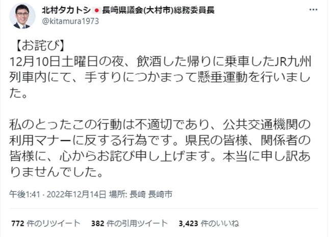 電車内で酒に酔って懸垂を繰り返すなどしたことについて、記者会見して説明した長崎県の北村貴寿県議(49)(自民党)の狼狽ぶりが話題になっている。