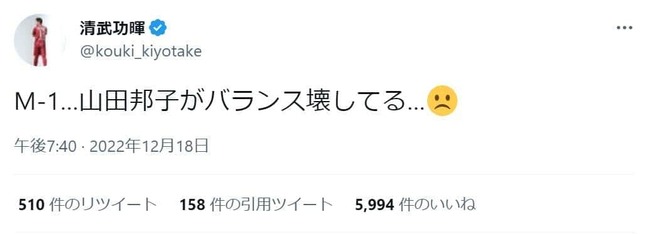 清武選手は「真空ジェシカ」の採点が終わった直後、口をへの字に曲げた絵文字を添えて「M-1...山田邦子がバランス壊してる...」と苦言を呈した。