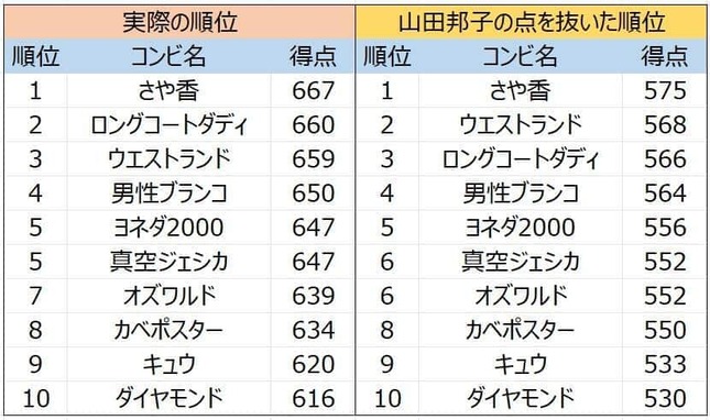 ツイッター上で拡散している、M-1の審査員7人合計点の順位と、山田さんの点数抜きの順位とを比較した表を用いた反論もあった。見ると、山田さんの採点を差し引いても最終決戦に進む3組の顔ぶれは変わらず、「さや香」はいずれもトップ通過で、「ロングコートダディ」と「ウエストランド」の2位と3位が入れ替わるだけだった。4位以下も「ヨネダ2000」と5位タイだった「真空ジェシカ」が「オズワルド」との6位タイになるだけで、10位までの並びは同じだった。