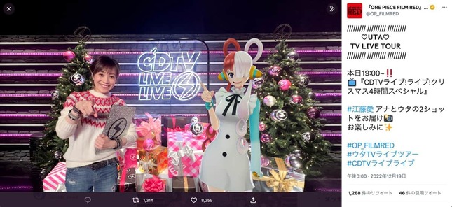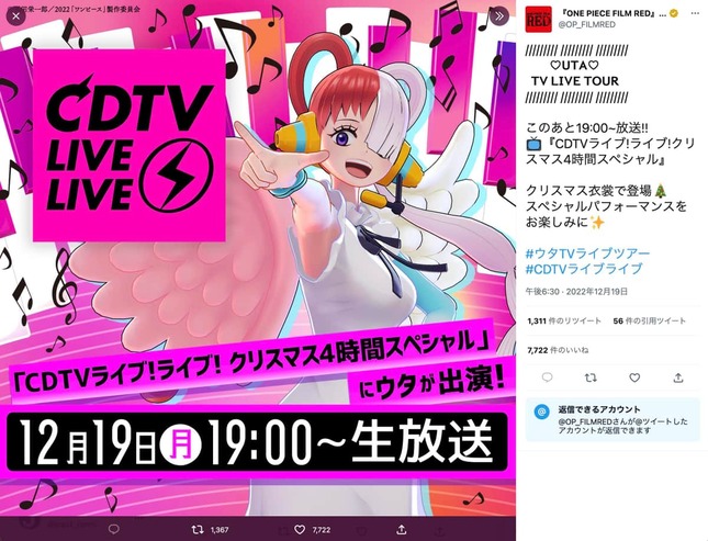 劇場版アニメ「ONE PIECE FILM RED」のキャラクター・ウタ(CV:名塚佳織さん/歌唱:Adoさん)が2022年12月19日、音楽番組「CDTVライブ!ライブ!クリスマス4時間SP」(TBS系)に出演した。