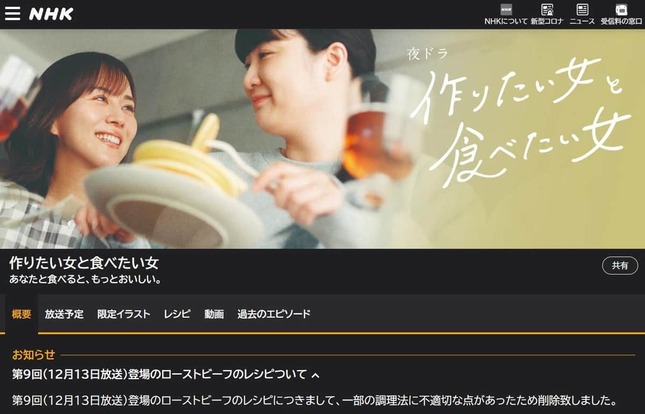 今回削除されたのは、第9話に登場したローストビーフのレシピだ。NHK公式サイトでは、「第9回(12月13日放送)登場のローストビーフのレシピにつきまして、一部の調理法に不適切な点があったため削除致しました」と掲載されている。22日現在、同レシピページは削除されている。