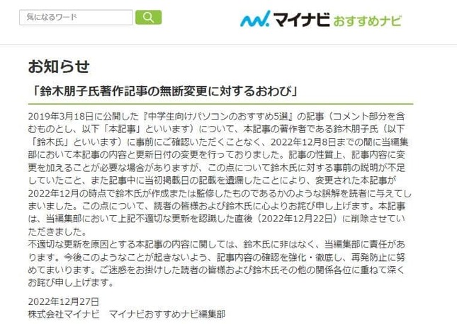 マイナビは2022年12月27日、約3年前に公開した記事を巡り、監修したITジャーナリストに無断で改変をしていたとして、「関係各位に重ねて深くお詫び申し上げます」と謝罪した。