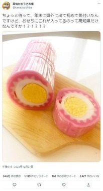 添付された写真には、珍しいかまぼこが写されている。ピンクの円筒形のかまぼこで、切り落とすと中にゆで卵が入っている。ゆで卵の周りは、白いかまぼこが覆っている。ツイートは約34.6万回表示され、一部のツイッターユーザーからは「これ何なんだろ」「え、何この美味しそうなの??」などと驚きの声が寄せられた。