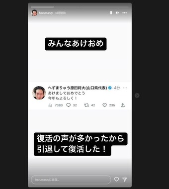インスタグラムのストーリーでも「みんなあけおめ 復活の声が多かったから 引退して復活した!」と投稿した。