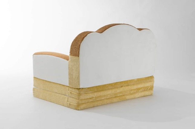 食パンソファベッドは、白い面がパンの耳のようなこんがりとした茶色で縁どられている。背もたれ部分はもこもこした山形の食パンを象る。背もたれとひじ掛けはやや硬めの材質になっており、手や背中をかけることができる。