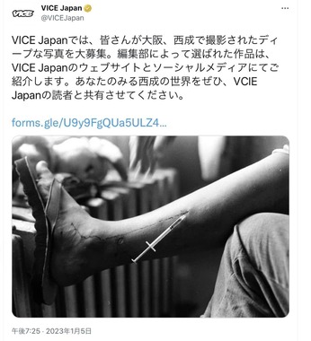 VICE Japanは2023年1月23日まで、大阪・西成区で撮られた写真作品を「Googleフォーム」を通じて募集。公式ツイッターは1月5日19時25分に「VICE Japanでは、皆さんが大阪、西成で撮影されたディープな写真を大募集。編集部によって選ばれた作品は、VICE Japanのウェブサイトとソーシャルメディアにてご紹介します。あなたのみる西成の世界をぜひ、VCIE Japanの読者と共有させてください」(原文ママ)と呼びかけた。ツイートには注射器が刺さった足の写真を添付していた。