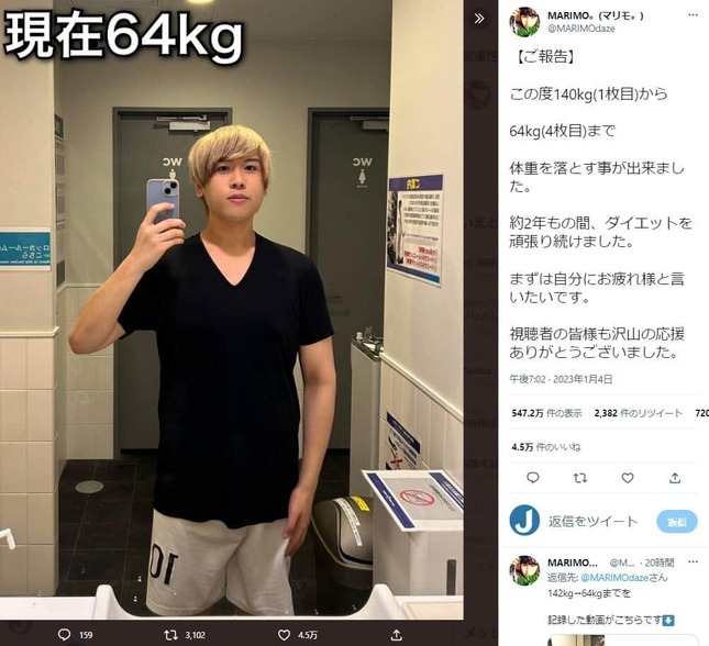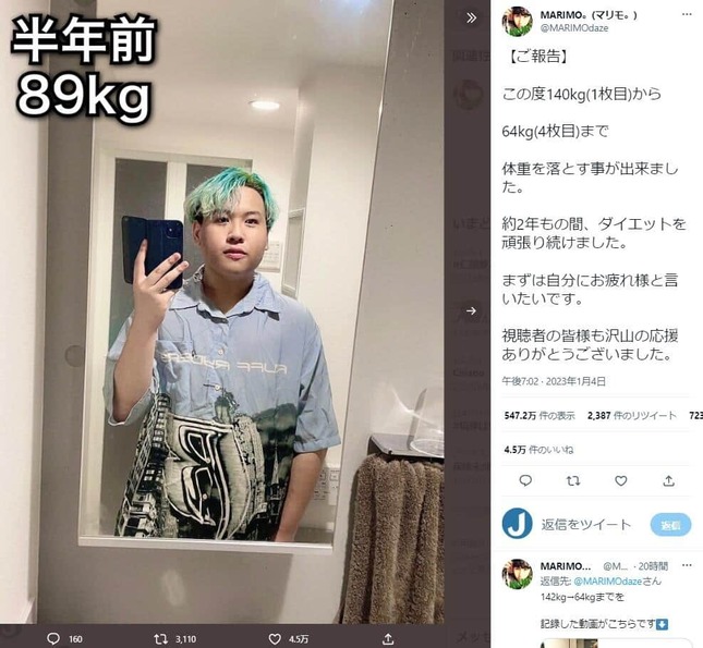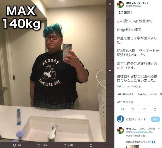 チャンネル登録者数33万人のYouTuber「MARIMO。(マリモ。)」さんが2023年1月4日、約2年間で体重140キログラムから64キログラムまで減量したことをツイッターで報告した。ビフォーアフターの写真に、ユーザーからは驚きの声が上がっている。