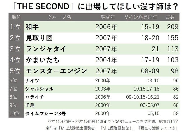 J-CASTニュースは22年12月26日~23年1月5日16時まで、「M-1決勝進出経験者」「M-1優勝経験なし」「現在も活動している」の3条件を満たすコンビの中から、大会に出場してほしいコンビをサイト内で読者に聞いた。総票数1651票の中から、ここでは上位5組を紹介する。
