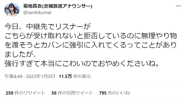 ラジオ局・茨城放送の菊地真衣アナウンサーが2023年1月5日、強制的にプレゼントを押し付けられる被害に遭ったとして、ツイッターで「強行すぎて本当にこわいのでおやめください」と呼びかけた。