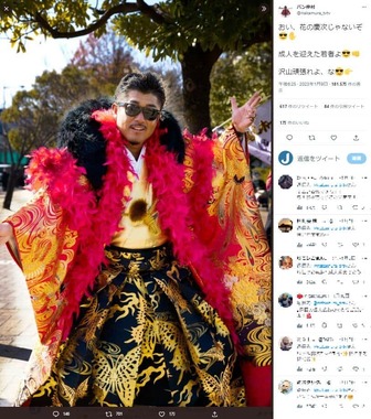 ツイートに対し、仲村さんの登場に「袴めっちゃ似合ってます」「華あり過ぎ!」「新成人絶対喜ぶと思います!」と盛り上がる声が多く寄せられ、会場に居合わせたと見られるユーザーからも感謝のコメントが寄せられていた。一方、一部のユーザーからは「いい歳して何やってんの」「これが大人のやる事ですか?」「恥ずかしいオッサン」などと否定的な声もあがった。