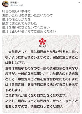 翌10日には「昨日の悲しい事件でお問い合わせを多数いただいた」と明かし、一般的な布についた墨汁の「落とし方」が書かれた説明文を投稿した。同社は投稿に際し「墨汁を嫌いにならないでください」と呼びかけ、「墨汁は正しい使い方でご使用ください」と利用者への注意喚起を行っている。