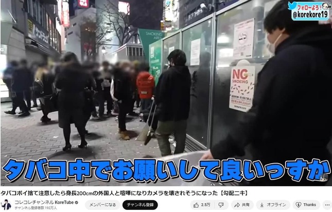 登録者数192万人超の人気YouTuberコレコレさんが2023年1月22日の動画で、YouTuberの「ぷぅ」さんとともに、路上喫煙者に注意を促す様子を公開した。
