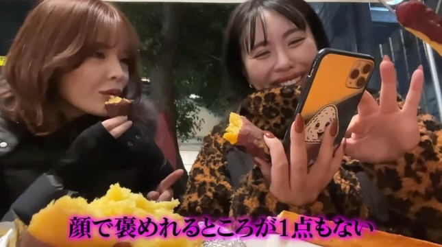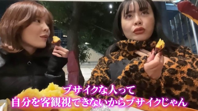 妹尾さんは焼き芋を口にしながら、「焼き芋並んでるときに気づいたことがあった。すんごいイチャイチャしたカップル」と話題を変えると、「駅前とか公共の場でイチャついてる人たちってブサイクしかいないじゃん。あれ、なんでか分かった。ブサイクな人って自分を客観視できないからブサイクじゃん。そういうこと」などとコメント。「美人は自分を客観視できるからそういうことをするような人間にはならない。ブスは自分を客観視できないから、公衆の面前でああいうことができる」とも語った。