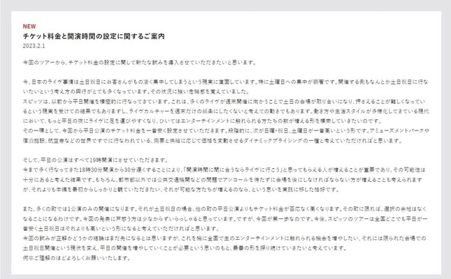 スピッツは公式ホームページで、全国ツアーの詳細と同時に、「チケット料金と開演時間の設定に関するご案内」とする長文の文書を公開した。