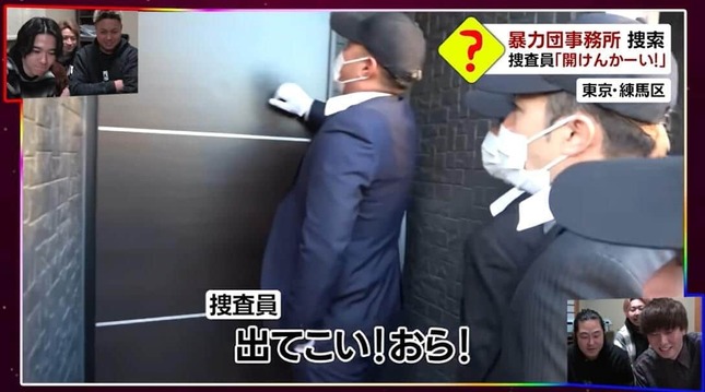 事務所とされる玄関の前に到着すると、扉を乱暴に叩き「オラ!開けろー!」「出てこい!オラァ!」などと、一斉に怒号を上げる捜査員たち。続けて、容疑者の顔写真を提示し「今回の捜索は亜威喪科組の幹部・悪岡健二容疑者の逮捕に向け行われたものです」と注釈するも、扉を開けて出てきたのは全くの別人。