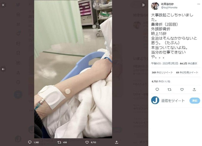 人気セクシー女優の辻井ほのかさんが2023年2月2日、「大事故起こしちゃいました」として、傷のある顔の自撮り写真をツイッターで公開した。