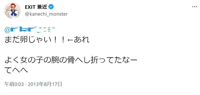 報道を受け再注目されたのは、兼近さんが2013年8月17日にツイッターに投稿した「まだ卵じゃい!!←あれ よく女の子の腕の骨へし折ってたなー てへへ」とした投稿だ。別のユーザーへのリプライで投稿され、現在は相手の関連ツイートが削除されているのか、話の流れを確認できないが、「よく女の子の腕の骨へし折ってた」という内容が一部で問題視された。