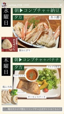 翌5日には水曜日と木曜日の食生活もアップ。水曜日の夕食は「カニ酢、蟹おにぎり」、木曜日の夕食は「サーモンステーキ、ラタトゥイユ、ゴロゴロ野菜、鶏ムネ肉、ブロッコリー」と紹介している。