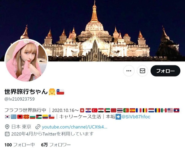 YouTuber「世界旅行ちゃん」が2023年2月4日、南米チリで起こったトラブルをツイッターで伝えた。激臭を放つバスに搭乗した際、トイレを利用したところ、運転手に怒鳴られ荷物を没収された挙句トイレ掃除をさせられたという。