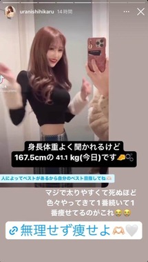 浦西さんはこれまで何度か体重を公表してきた。1月22日の投稿では41.6kgであると明かし、一部ユーザーからの「普通に食べて、あの体型はありえん」とするDMに「めっちゃ太る。普通の人より太りやすいから頑張ってます」と反論。「夜中食べすぎて ちょっとだけ増えた」とした29日の投稿では、41.8kgであることを報告していた。