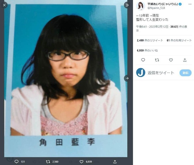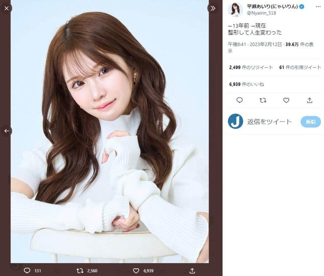 「にゃいりん」の名前で活動しているグラビアアイドルの平瀬あいりさんが2023年2月12日、整形のビフォーアフター写真をツイッターで公開した。