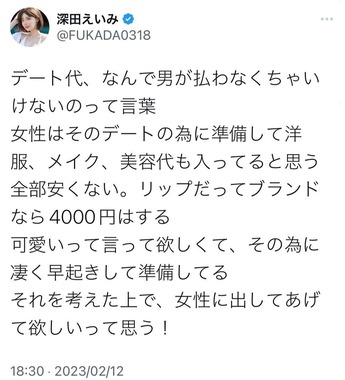 デート代の支払いをどうするかについて、「女性はそのデートの為に準備して洋服、メイク、美容代も入ってると思う 全部安くない。リップだってブランドなら4000円はする」「可愛いって言って欲しくて、その為に凄く早起きして準備してる」とし、「それを考えた上で、女性に出してあげて欲しいって思う!」と主張。投稿には賛否の声が寄せられ、深田さんは13日までに投稿を削除した。