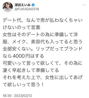 デート代をめぐってはセクシー女優・深田えいみさんが12日、ツイッターに投稿した内容が賛否両論を呼んだ。