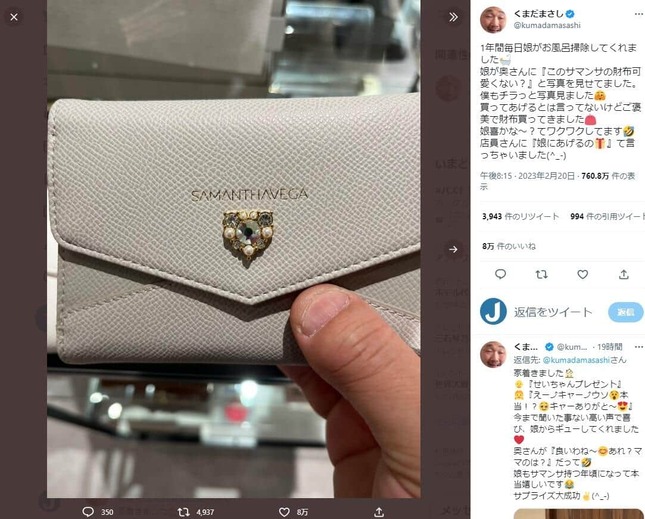 くまださんは、「1年間毎日娘がお風呂掃除してくれました 娘が奥さんに『このサマンサの財布可愛くない?』と写真を見せてました。僕もチラっと写真見ました 買ってあげるとは言ってないけどご褒美で財布買ってきました」などと報告し、プレゼントに用意した白のブランド財布の写真を公開した。