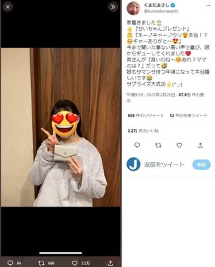 公開された写真は、帰宅前に店舗で撮影したものと見られ、くまださんは「娘喜かな~?てワクワクしてます 店員さんに『娘にあげるの』て言っちゃいました」(原文ママ)などと心境を伝えていた。