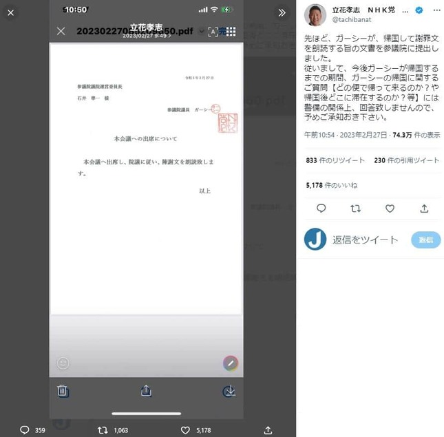 NHK党のガーシーこと東谷義和参議院議員が2023年2月27日、参議院から求められた「議場の陳謝」に応じる意向を示した文書を秘書を通じて提出した。