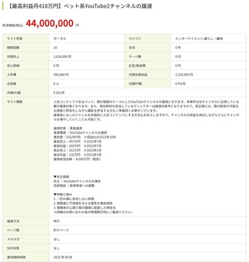 サイト売買サービス「SiteStock(サイトストック)」に掲載されていたのは、「【最高利益月418万円】 ペット系YouTube2チャンネルの譲渡」との案件だ。掲載は2月28日付で、売却希望価格は4400万円に設定している。