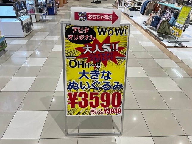 スーパーマーケット・アピタ長岡店に置かれた店頭販促物(POP)が、SNSで「神デザイン」などと話題になっている。大きなぬいぐるみの売り場を、冒頭のような独特な言い回しで熱烈に宣伝する。赤や黄、黒などのビビッドな色を用いた派手なデザインでありながら、商品情報を分かりやすく伝えていると好評だ。
