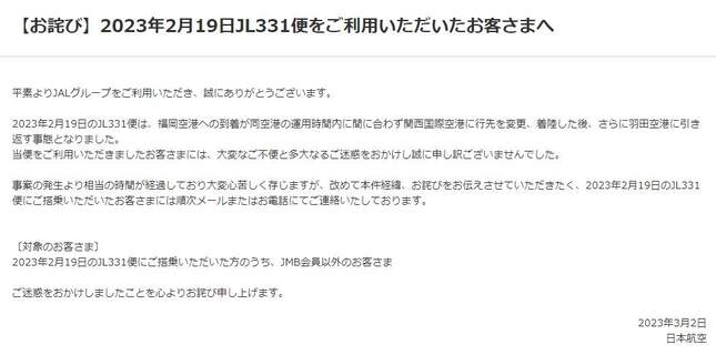 日本航空(JAL)331便が福岡空港の運用時間である22時に間に合わず、出発地の羽田空港に引き返した騒動について、JALは2023年3月2日、公式サイトでお詫びを伝える発表文を掲載した。