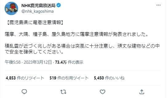 NHK鹿児島放送局は12日18時頃、「鹿児島県に竜巻注意情報」と題した注意喚起をツイートした。
