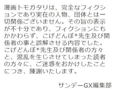 「漫画トモガタリは、完全なフィクションであり実在の人物、団体とは一切関係ございません。その旨の表示が不十分であり、フィクションにもかかわらず、こげどんぼ*先生及び関係者の事と誤解させる内容でした」