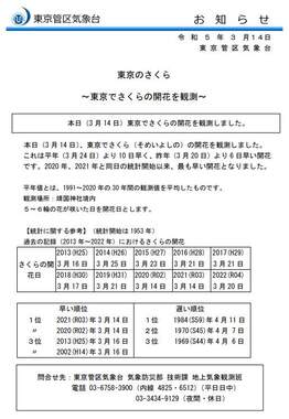 気象庁は3月14日、東京で桜(ソメイヨシノ)の開花を観測したと発表。1991~2020年の観測値を平均した平年値よりも10日早く、2022年よりも6日早い開花になった。