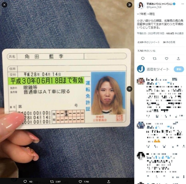 この日は、7年前のものだという金髪姿の免許証写真と現在の「ビフォーアフター」写真を公開。免許証の氏名は「角田藍李」となっており、「小さい頃からの顔面、劣等感の塊の角田藍李は捨てて生まれ変わった平瀬あいりとして生きる」とメッセージを添えている。