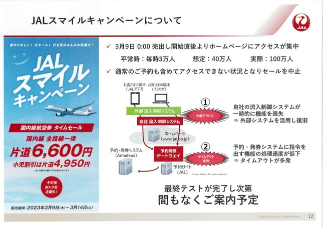 通常、JALのウェブサイトには毎時3万人程度がアクセスし、過去の格安キャンペーンでは20万~30万人程度がアクセスしていた。そこで、40万人のアクセスを想定して準備していたが、100万人が殺到したという。