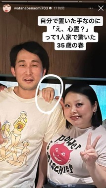 仲睦まじいショットだが、渡辺さんはじろうさんの肩に置かれた手が気になったようだ。次の投稿でその小さな手に丸印をつけ「自分で置いた手なのに『え、心霊?』って1人家で驚いた 35歳の春」と自分自身の手にツッコミを入れている。