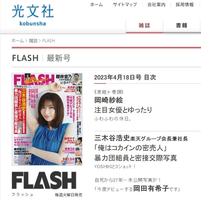 「FLASH」の4月4日発売号では、「『俺はコカインの密売人』暴力団組員と密接交際写真YOSHIKIと3ショット!」などと三木谷氏の疑惑を報じた。ウェブサイト「Smart FLASH」にも掲載した。