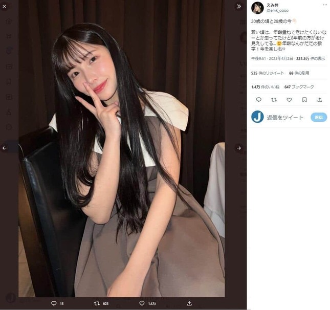 4月2日のツイッターで、えみ姉さんは「20歳の頃と28歳の今」として4枚の比較画像を公開。「若い頃は、年齢重ねて老けたくないなーとか思ってたけど8年前の方が老け見えしてる」と現在の容姿に満足げな様子で、「年齢なんかだだの数字! 今を楽しも」(原文ママ)と呼びかけた。
