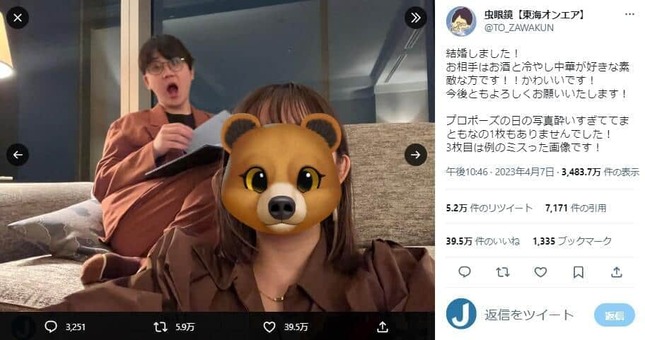 虫眼鏡さんは7日、「結婚しました!お相手はお酒と冷やし中華が好きな素敵な方です!!かわいいです!」とツイッターで発表した。婚姻届の写真や、妻とのツーショットも披露している。