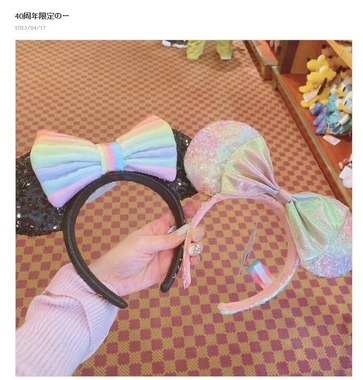 同日昼頃のブログでは、40周年限定グッズである、パステルカラーのリボンがついた黒いスパンコールのカチューシャと、ピンクを基調としたスパンコールのグラデーションが華やかなカチューシャの写真を掲載し、「どっちも可愛くて迷う」。TDRを満喫している様子だった。
