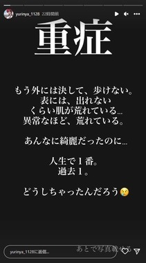 この日、ゆりにゃさんは投稿で「重症 もう外には決して、歩けない。表には、出れない くらい肌が荒れている...異常なほど、荒れている。あんなに綺麗だったのに...人生で1番。過去1。どうしちゃったんだろう あとで写真載せる」と、肌荒れに悩まされていることを明かした。
